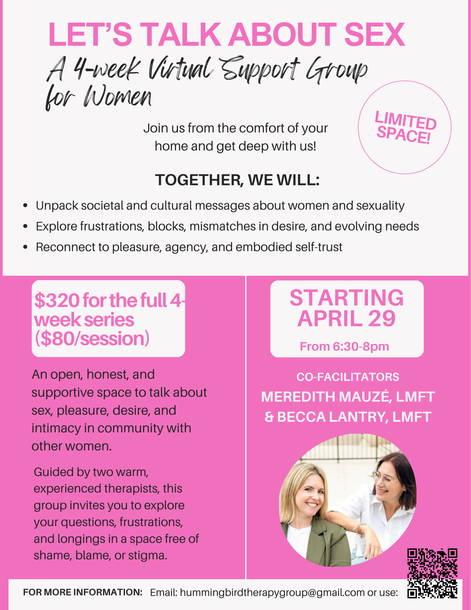 Together, we will create a supportive environment where women can share experiences, reflect on cultural messages about sexuality, and reconnect with their own desires, boundaries, and values.